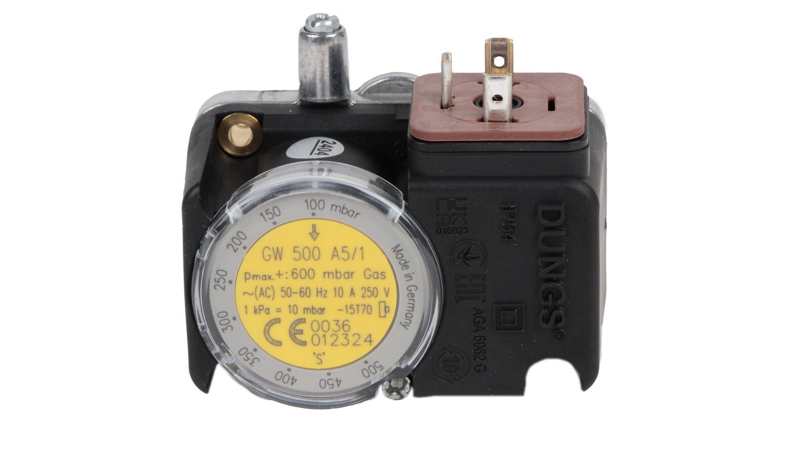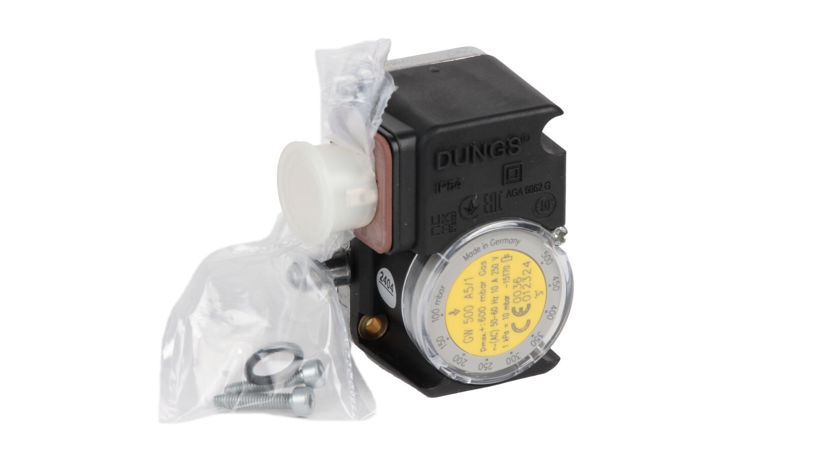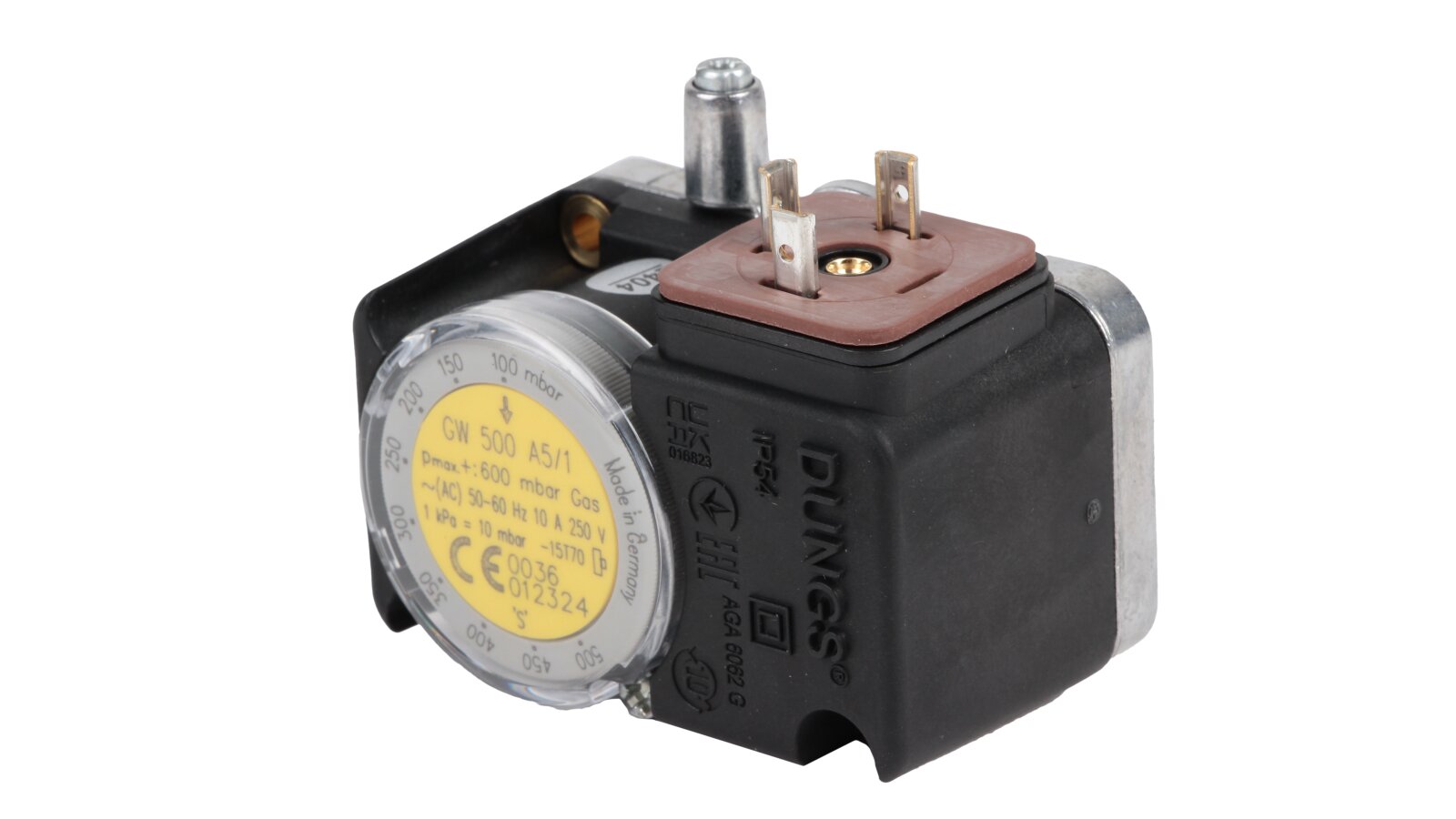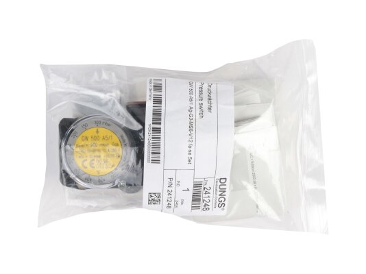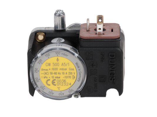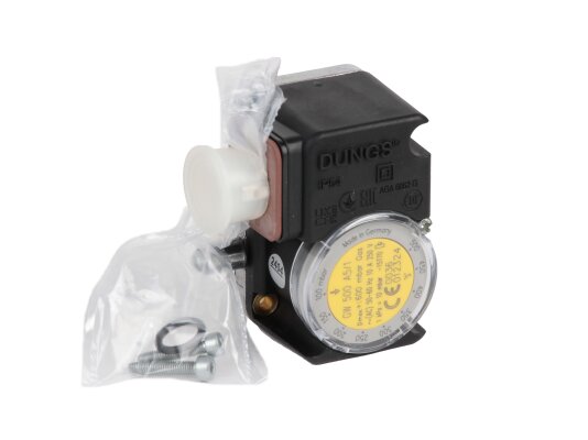 Pressure relay Dungs GW 500 A5/1, art: 241248 – adjustable sensor in a compact housing, used to control excess air pressure during operation of furnace and ventilation equipment with a working pressure of no more than 500 mbar. Characterized by high switching accuracy, reliable performance, ease of parameter adjustment (100-500 mbar). Response range: 0-25 mbar,