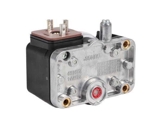 The sensor-relay is equipped with a damping nozzle. It is assembled in a compact housing, the base of which is cast from aluminum. The cover is made of impact-resistant, gas-tight polyamide. The sensitive membrane is made of elastic NBR rubber, does not collapse upon contact with flammable gases. The housing has a 9 mm diameter nipple for connecting a pressure gauge. The pressure parameters are adjusted by rotating the dial with a digital scale, located at the top of the device. The silver contacts are protected against dust / moisture according to the IP 54 standard. The connection is made using a plug.