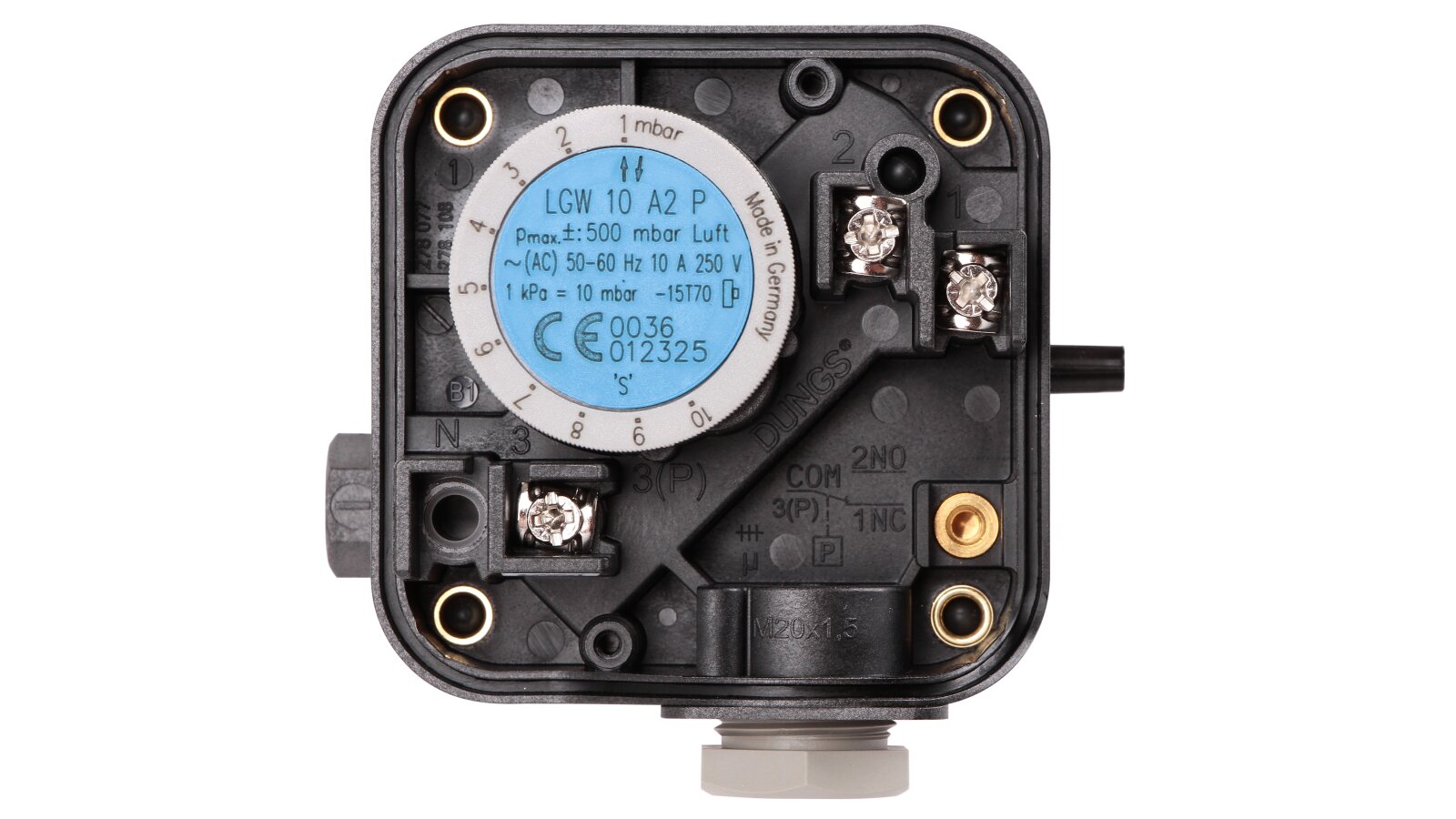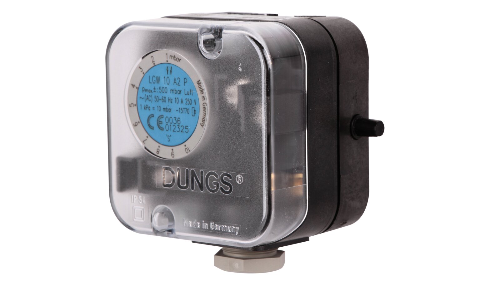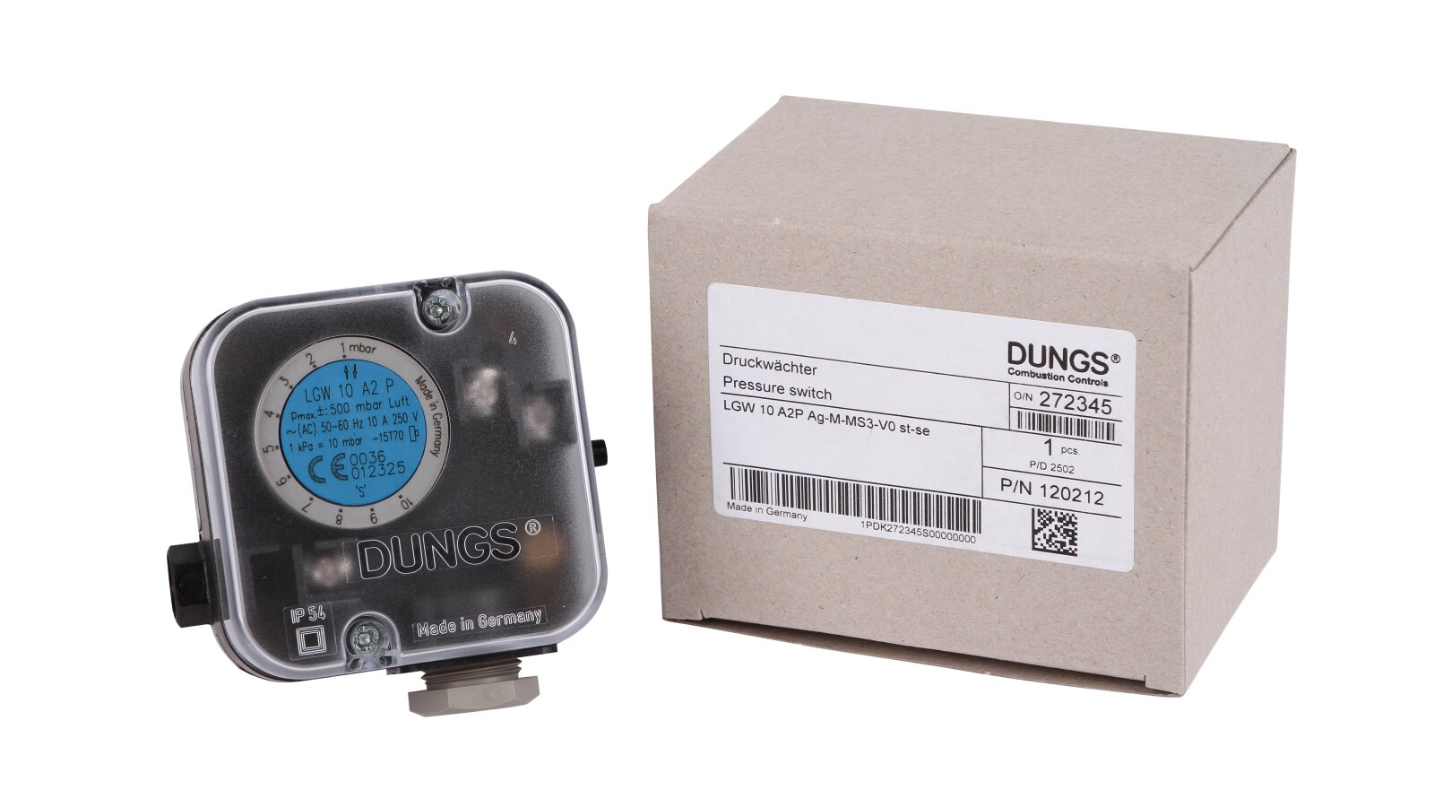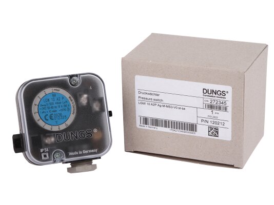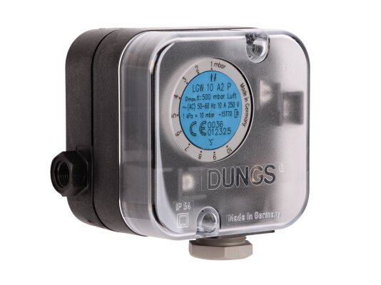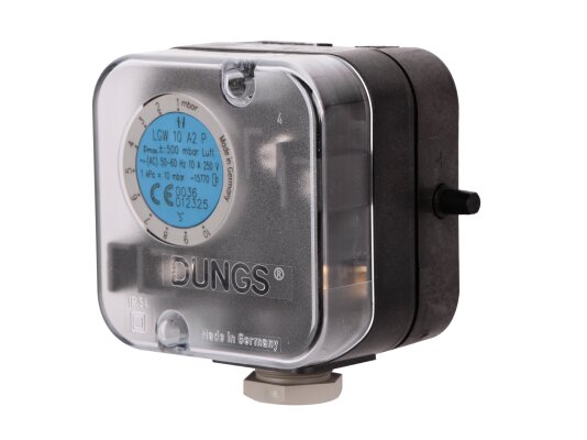 The Dungs LGW 10 A2P pressure switch, article 272345, is designed to monitor differential pressure. A special feature of the device is the presence of a control button, which is used to check the safety function. The universal sensor is used in furnace units, ventilation and air conditioning systems.