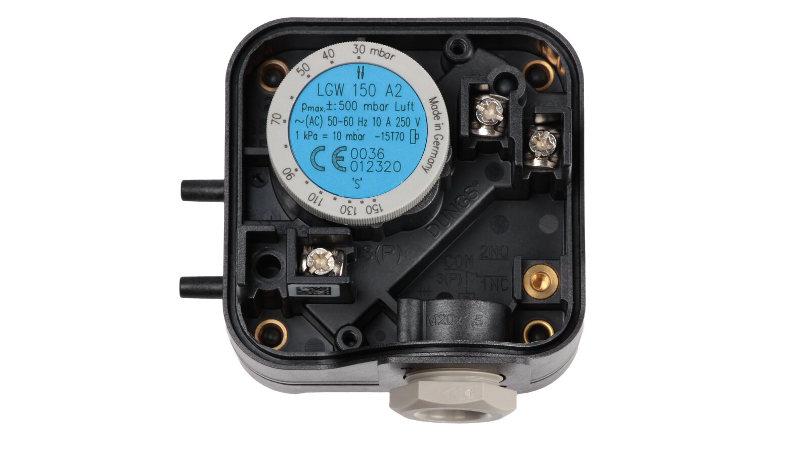 The Dungs LGW 150 A2 M pressure switch is an adjustable differential pressure control device for air, flue and exhaust gases. It is used in systems with excess pressure up to 500 mbar. It features a wide adjustment range, compact dimensions, and reliable design.