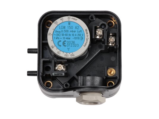 The LGW sensor operates on the principle of contact closure and signaling to the control unit when the pressure difference deviates from the specified limit. The response parameters are set by turning the adjustment disk and the scale with numbers.