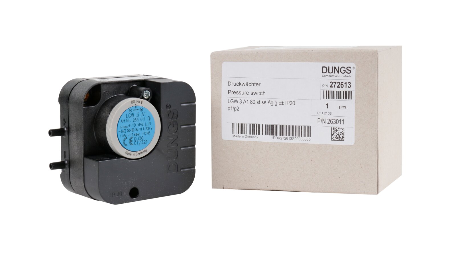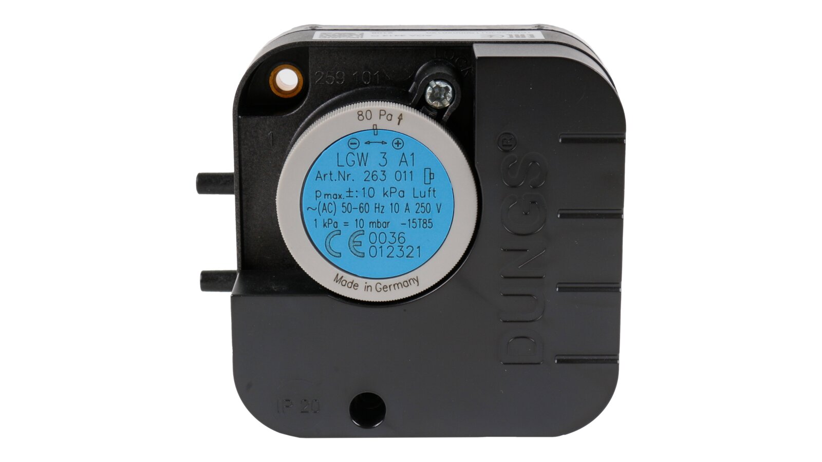 The Dungs LGW 3 A1 pressure switch, art: 272613, is used in automatic pressure control systems during operation of furnace units and other industrial equipment with a pressure of up to 100 mbar. Smoothly adjustable in the range of 0.4-3 mbar using an adjustment disk with a scale. It features precise, uninterrupted operation, reliable small-sized design, ease of installation and connection.