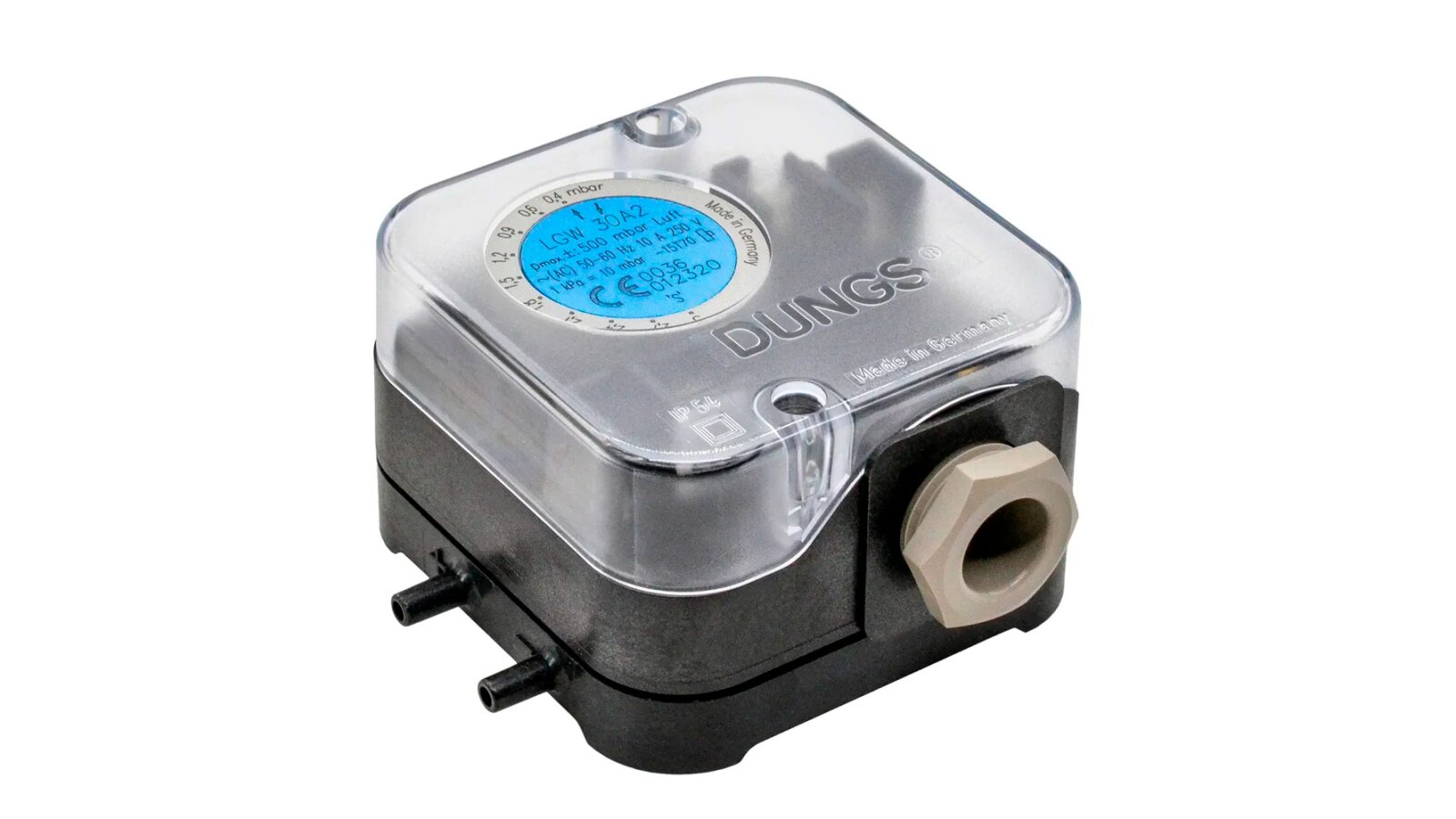The Dungs LGW 30 A2 pressure switch, art: 257438, is used to monitor air pressure. It is equipped with a highly sensitive membrane that responds to pressure changes. Compact dimensions simplify installation in confined spaces. A handwheel with digital markings is provided for setting the response point.