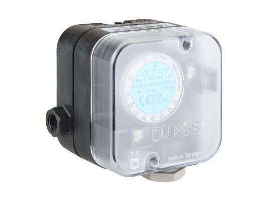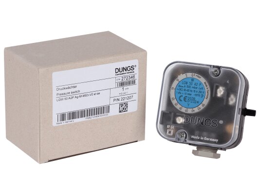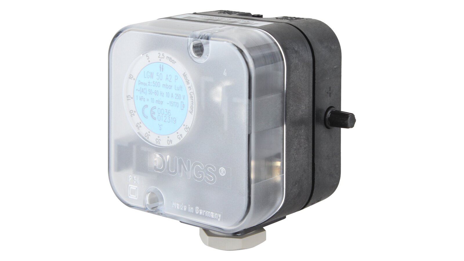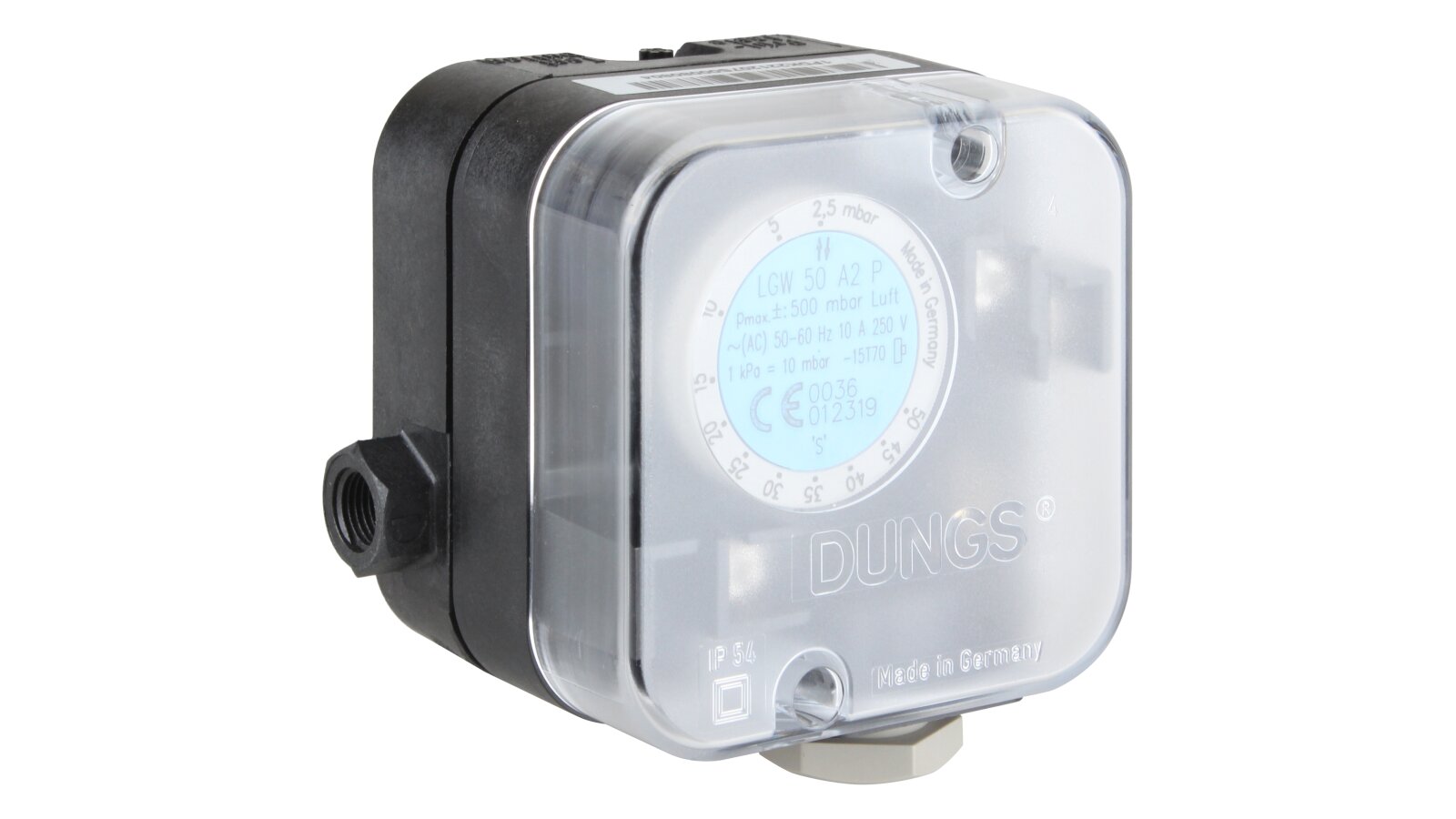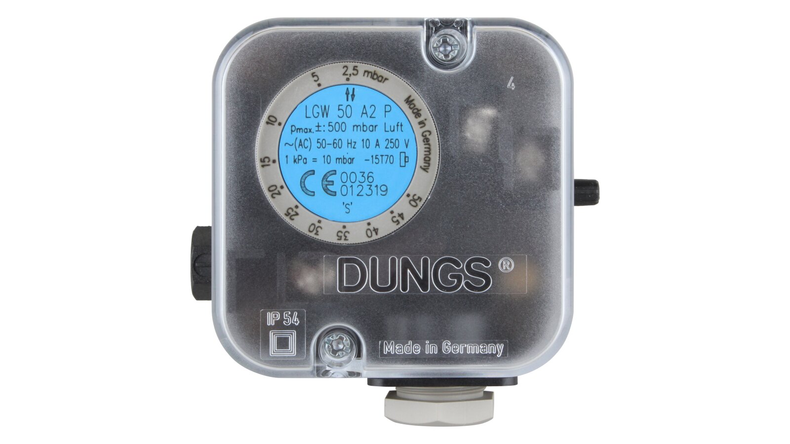 Pressure switch Dungs LGW 50 A2P article 272346 is a universal device for equipping furnace units, ventilation and air conditioning systems. Monitors differential gas or air pressure. A special design feature is the built-in test button for testing the safety function.
