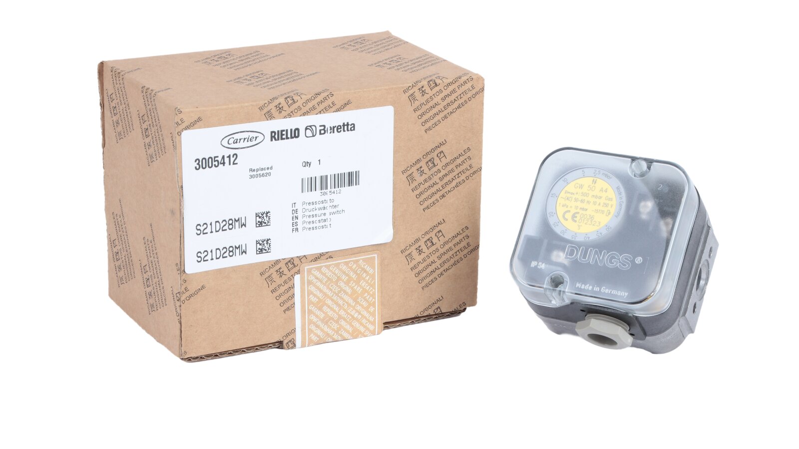 The Riello GW 50 A4 pressure switch can be used in furnace units, ventilation and air conditioning systems.