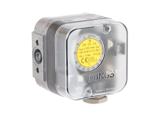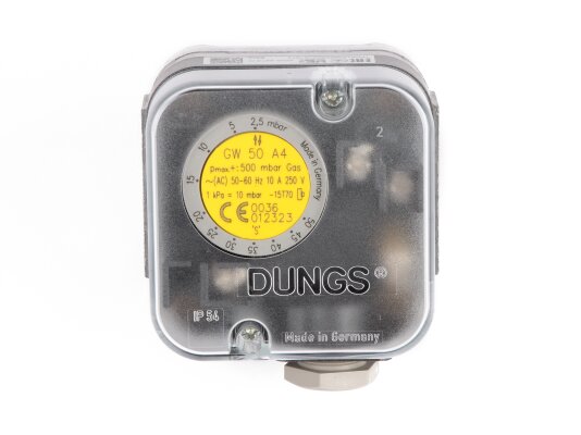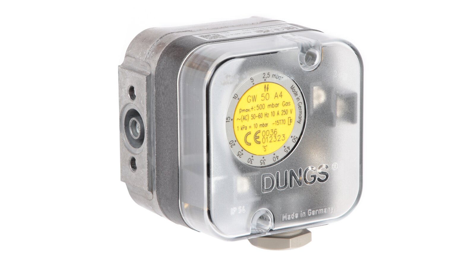 The Riello GW 50 A4 pressure switch, art: 3005412, is used in industrial equipment with gas/air pressure up to 500 mbar. The sensor is compact, easily fixed on the thread, and features stable, precise response. A dial with a scale is located on top of the housing for adjustment. The relay is used for automatic control of excess pressure.