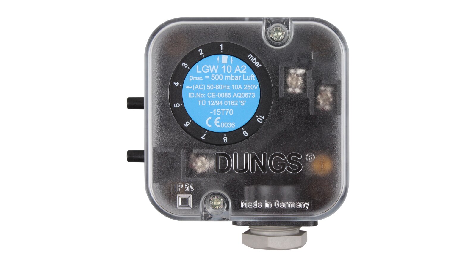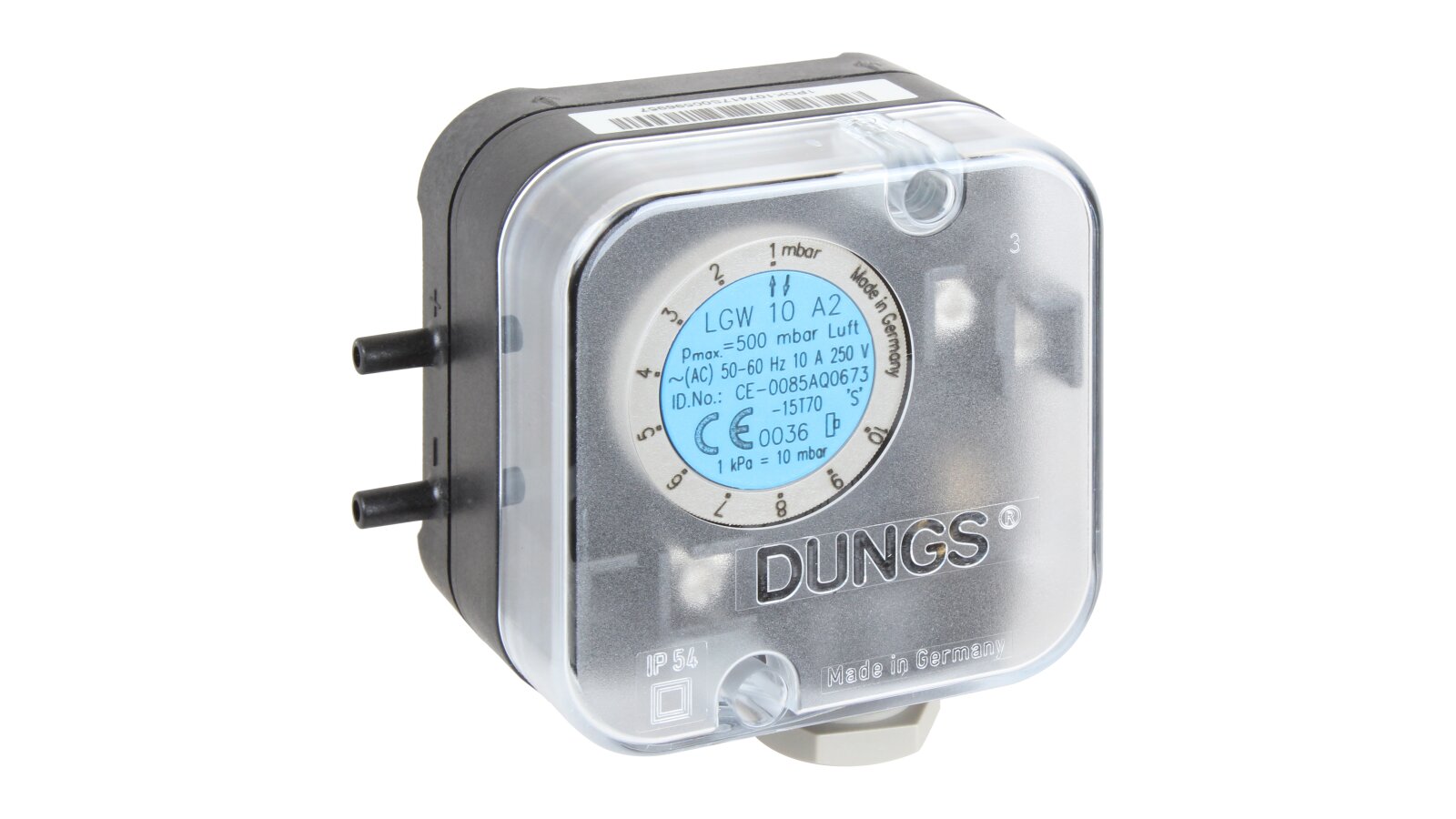 The Riello LGW 10 A2 M pressure switch, art: 3007444, responds to changes in differential pressure. It is adjusted in the range of 1-10 mbar by smoothly rotating the dial with a scale. The sensor is designed to work with air and a neutral gaseous medium, which allows it to be used in various industrial installations.