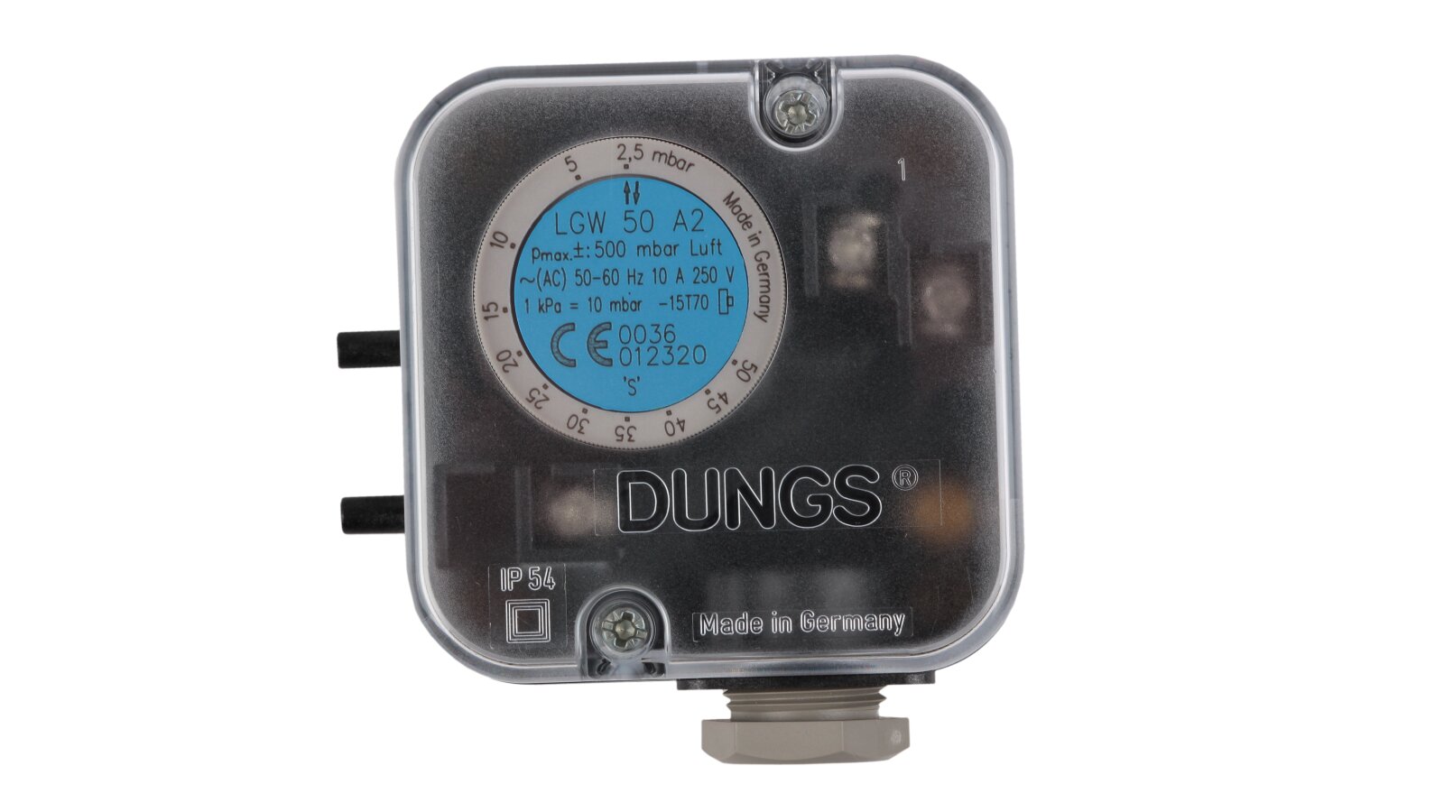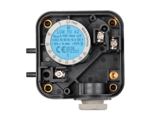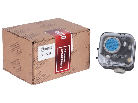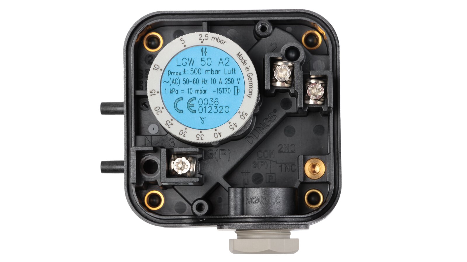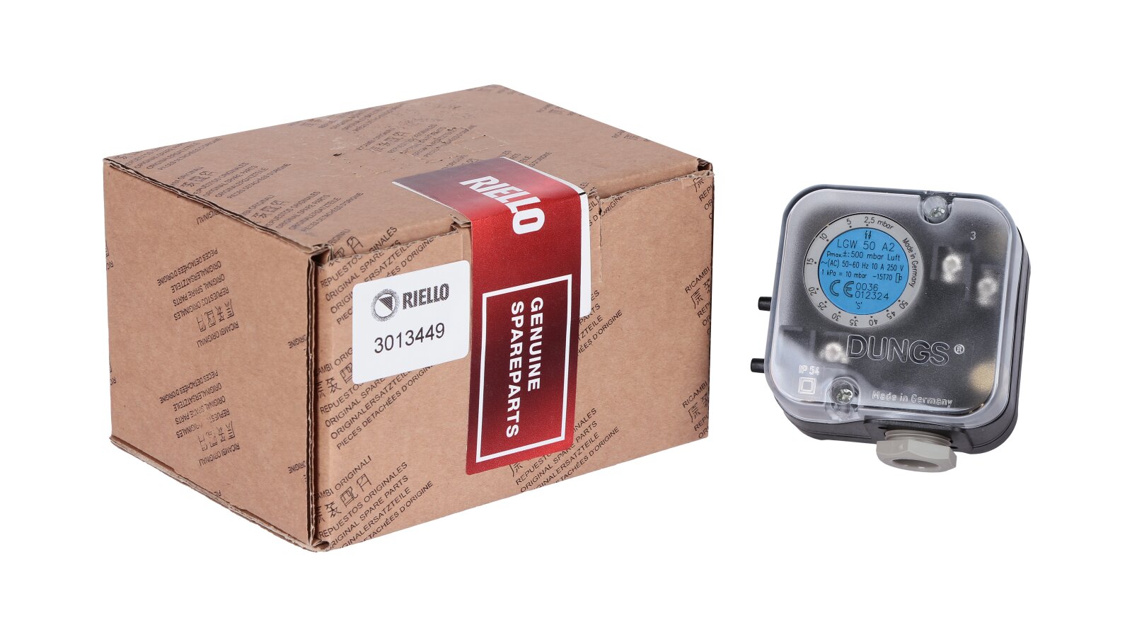 The Riello LGW pressure switch is used to monitor differential, excess pressure and vacuum pressure of air, flue and exhaust gases during operation of boilers, heat generators, ventilation systems, air conditioning with a working medium pressure of up to 500 mbar. The sensor cannot be used for technical flammable gases.
