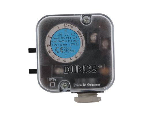 The Riello LGW 50 A2 M pressure switch, art.: 3013449, complies with class S of the EN 1854 standard. It is used to equip furnace and ventilation equipment. The compact device is easy to install, connect and configure. The response point is set within 2.5-50 mbar using a dial with a scale. Hysteresis is adjustable in the range of 0-1 mbar.