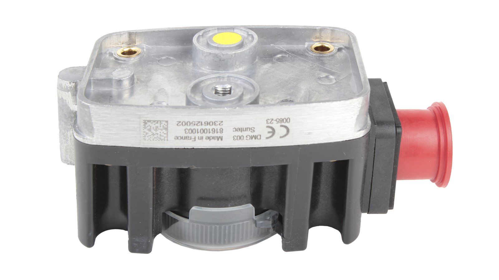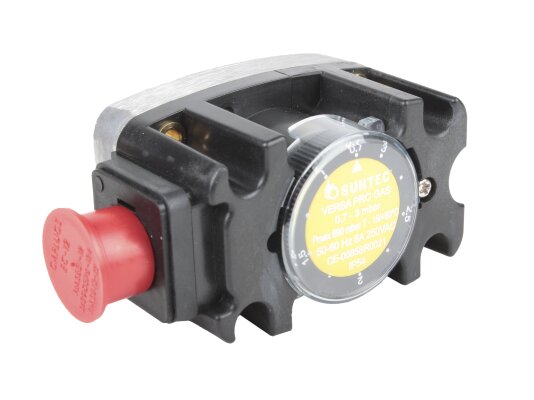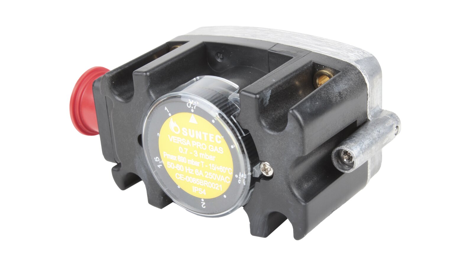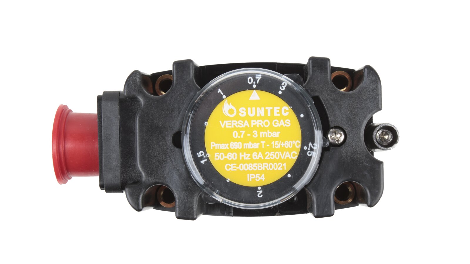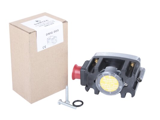 The Suntec DMG 003 pressure switch, art.: 8161001003, is used to monitor gas pressure in automation systems of furnace installations. It switches the electrical circuit on or off when the pressure drops below or rises above the set value. The sensor is easy to install, connect and configure. An adjustment disk with a digital scale is provided to set the switching point in the range of 0.7-3 mbar.