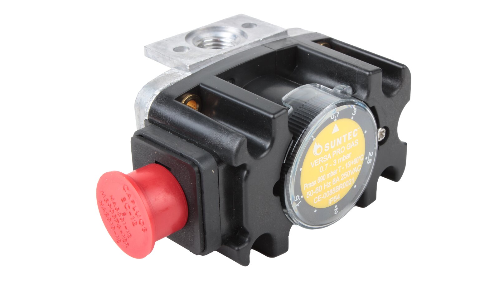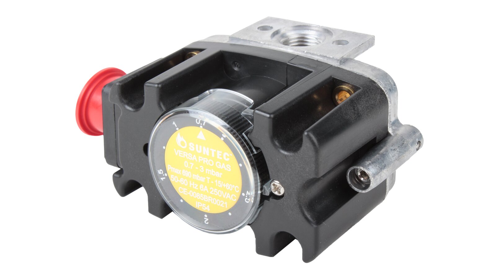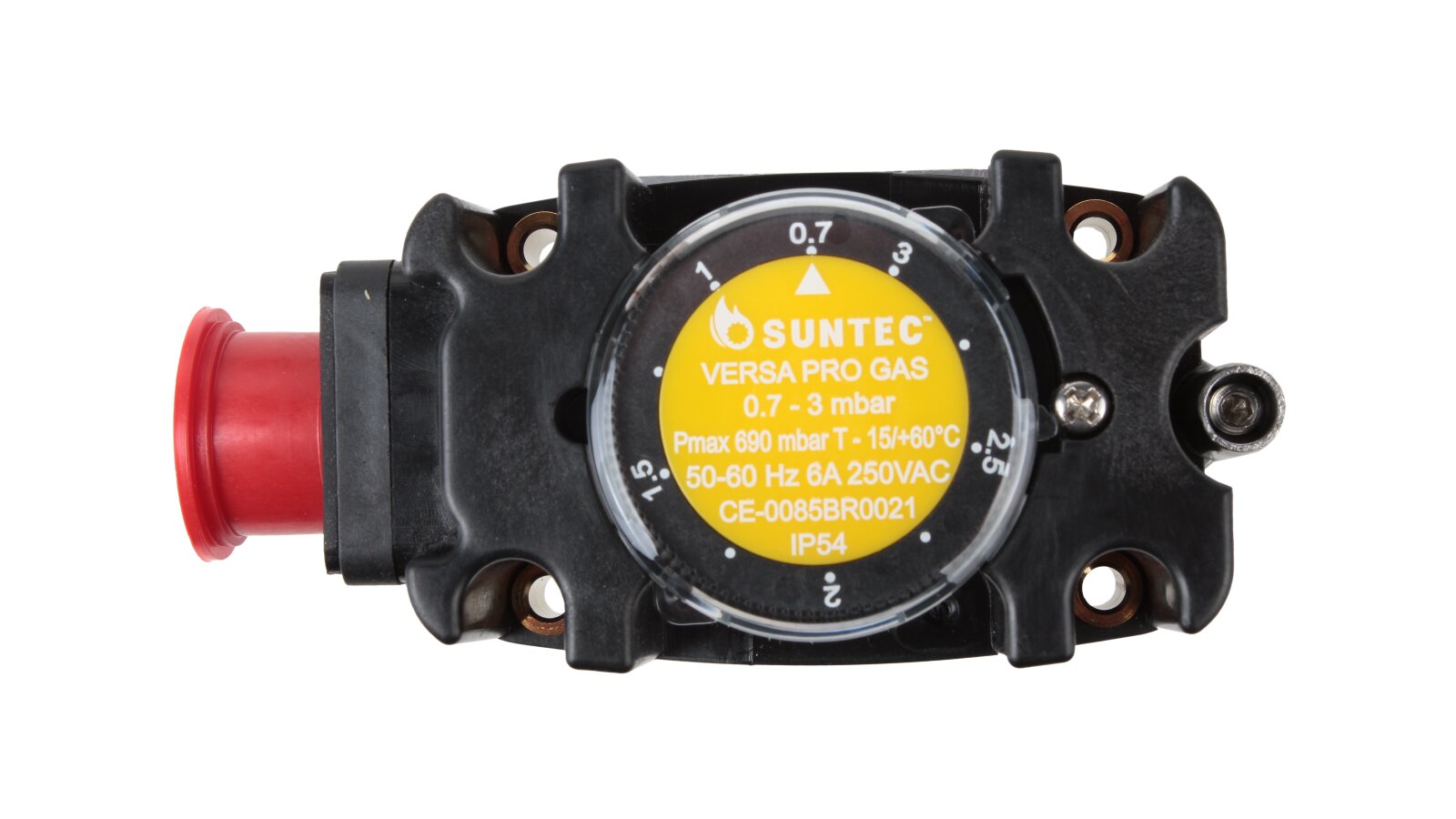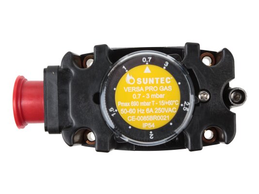 The Suntec FCG 003 pressure switch, art: 8171006003, is a compact switch equipped with a robust plastic housing with a die-cast aluminum base. It is used to automate gas supply in systems with pressures up to 690 mbar. It controls excess pressure and gas vacuum pressure. Adjustment range: 0.7-3 mbar. The contacts switch when the pressure drops below or rises above the set value.