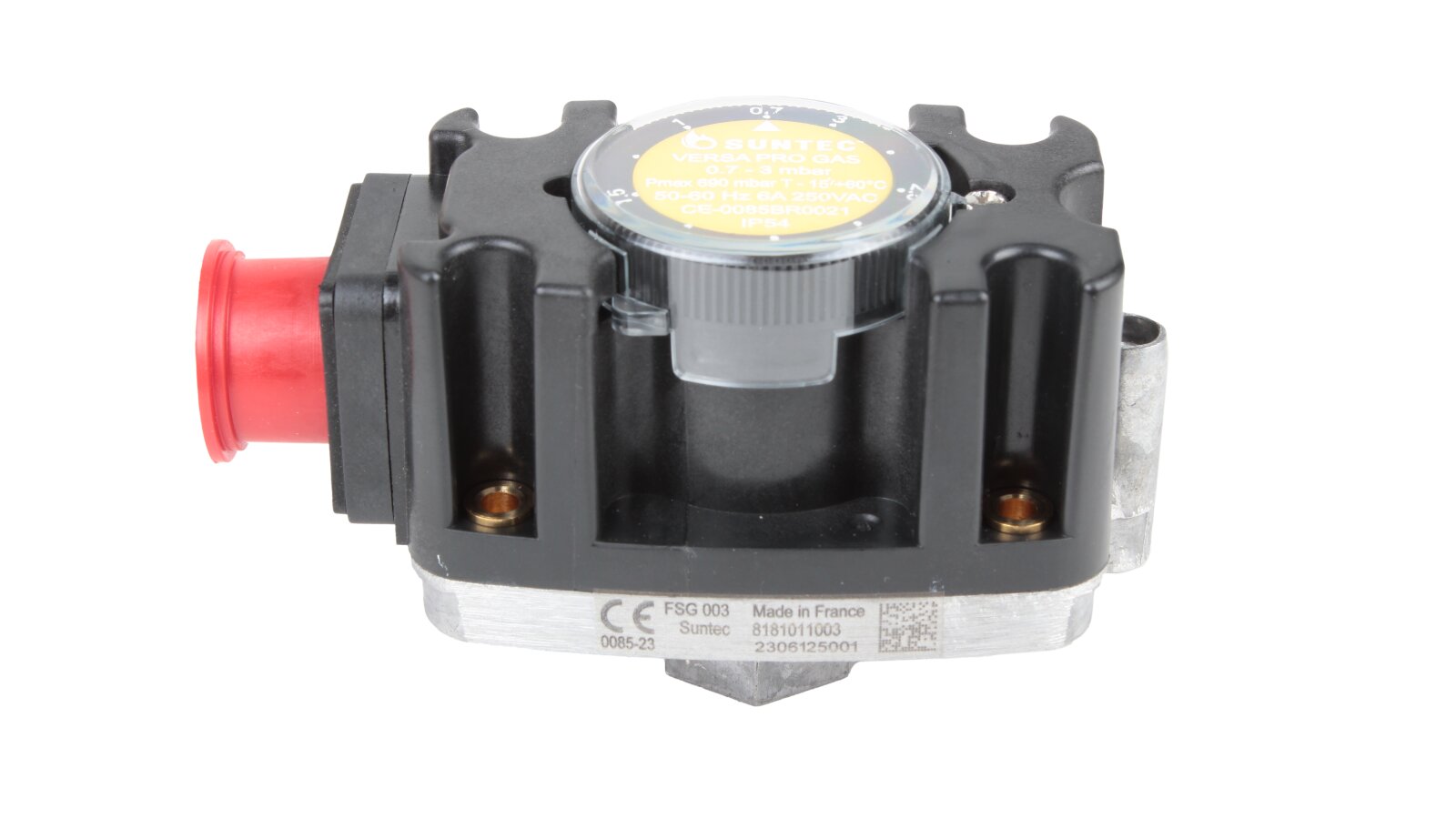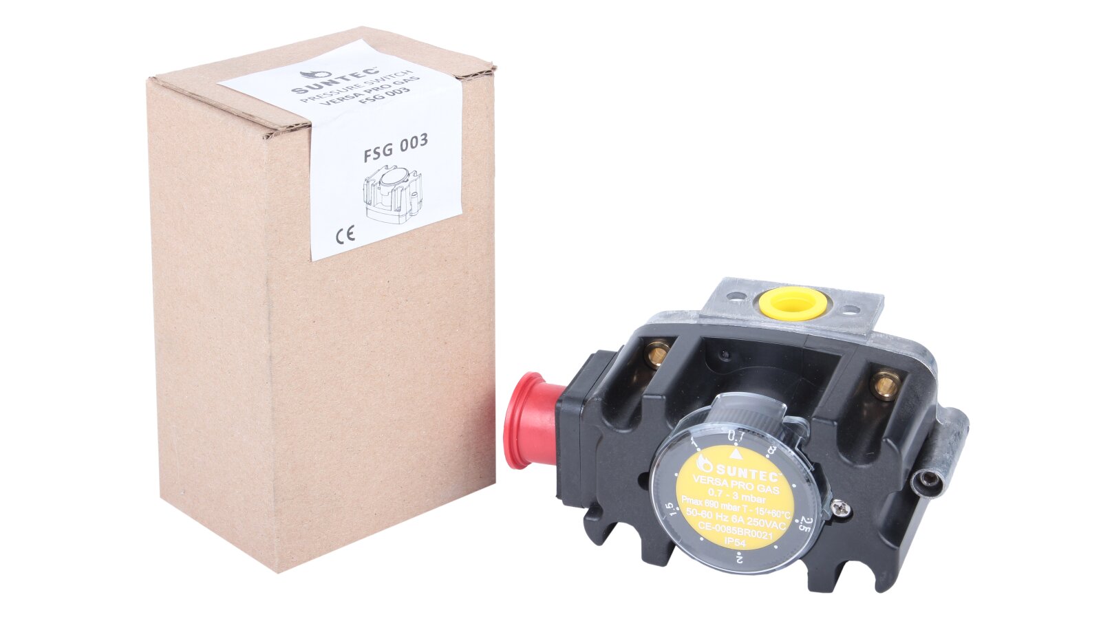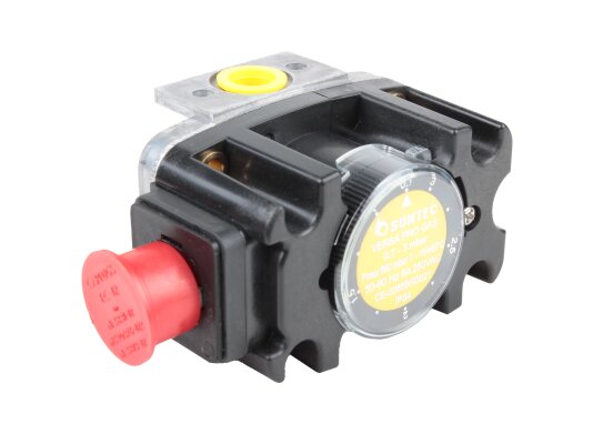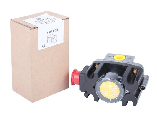 The Suntec FSG 003 pressure switch, art: 8181011003, is certified for operation with gas of the I-III family according to EN 437 standards. It is built into automatic flow control and regulation systems during operation of industrial combustion equipment. The switching mechanism responds to changes in excess and vacuum pressure, closing the contacts if the gas pressure falls below or rises above the specified limit.