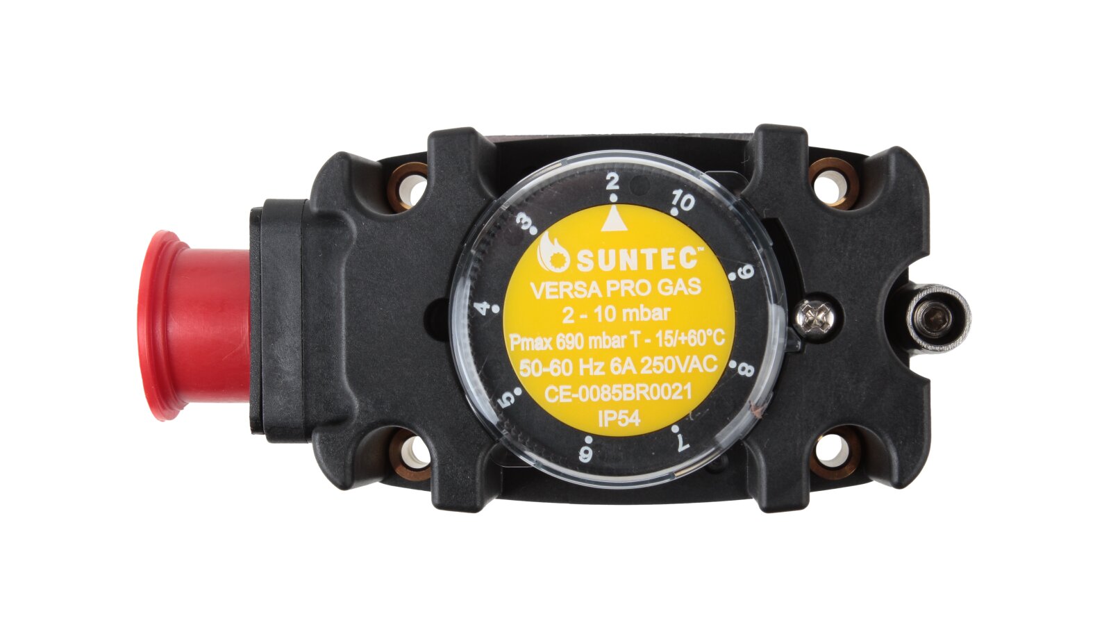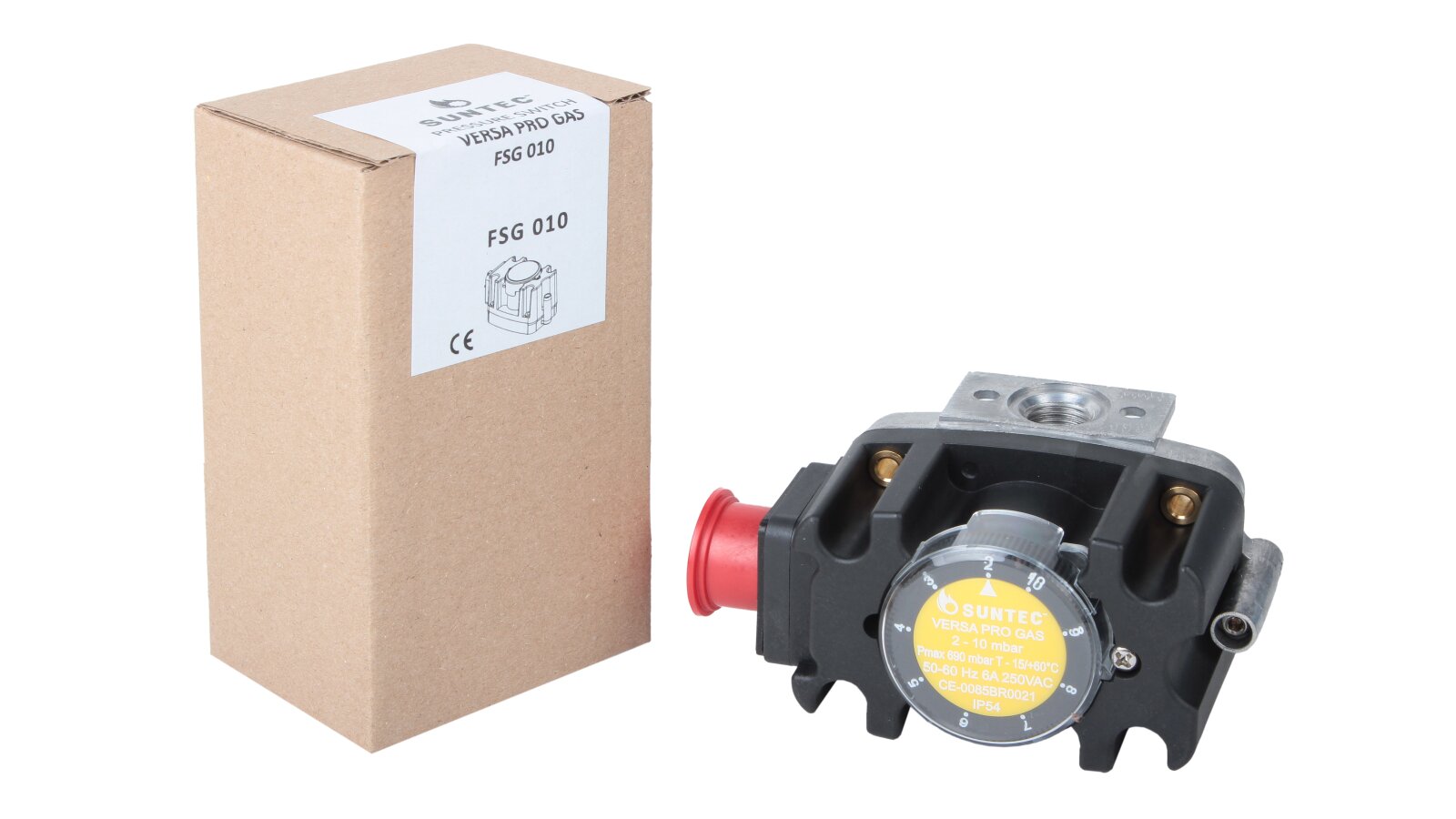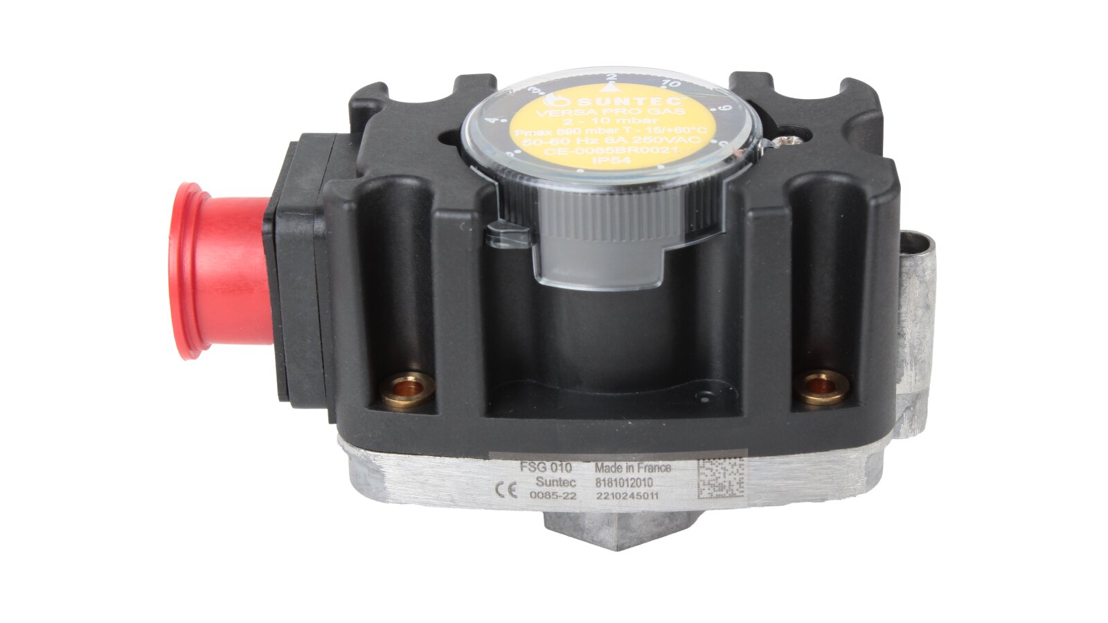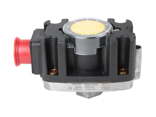 The Suntec FSG 010 pressure switch, art: 8181012010, is used in industrial burner automation devices. It is adjusted in the range of 2-10 mbar by rotating the adjustment disk with a scale. The working environment is gas of family I-III according to EN 437. The switch responds to changes in excess pressure and vacuum pressure, closing or opening contacts if the gas pressure drops below or rises above the set value.