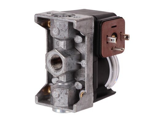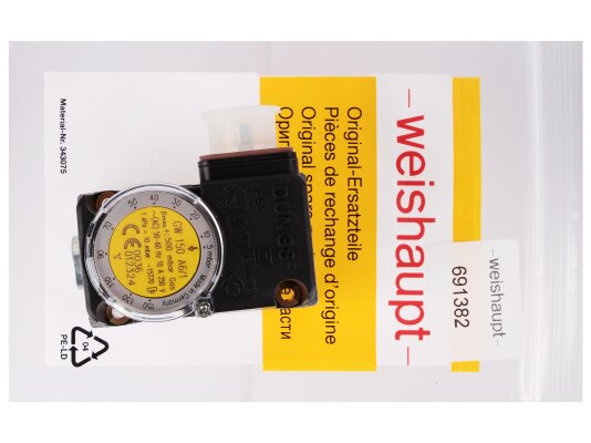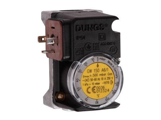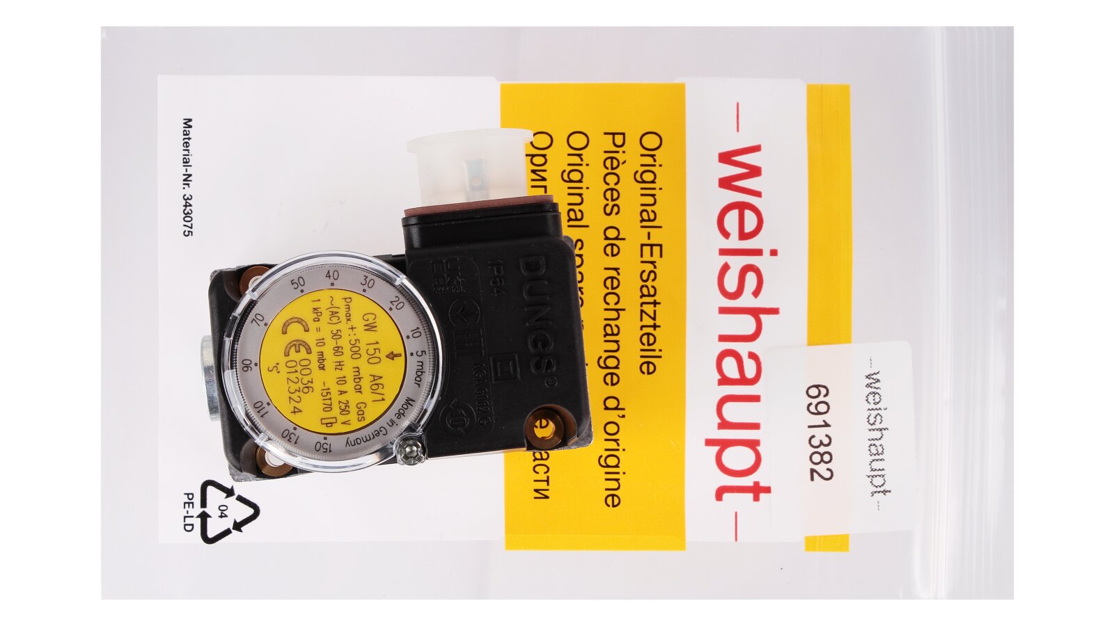 The Weishaupt GW 150 A6/1 pressure switch, art.: 691382, complies with class S of the EN 1854 standard. It is used for automatic pressure monitoring and gas supply regulation systems during operation of combustion units. The sensor is easy to install, connect and configure. An adjustment disk with a digital scale is provided to set the switching parameters in the range of 5-150 mbar. The damping nozzle eliminates frequent switching during short-term pressure deviations from the set parameters.