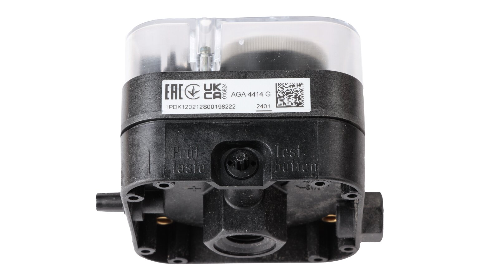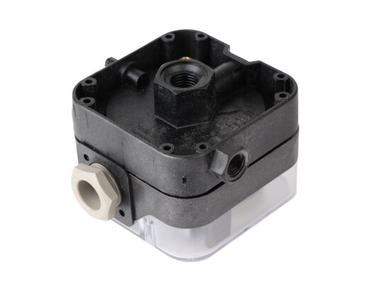 The differential pressure switch is equipped with a sensitive diaphragm made of NBR rubber and a reliable switching mechanism with standard contacts made of Ag. The compact housing with a cover and a switch are made of impact-resistant polycarbonate. A test button for checking the safety function is located below.