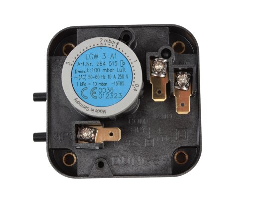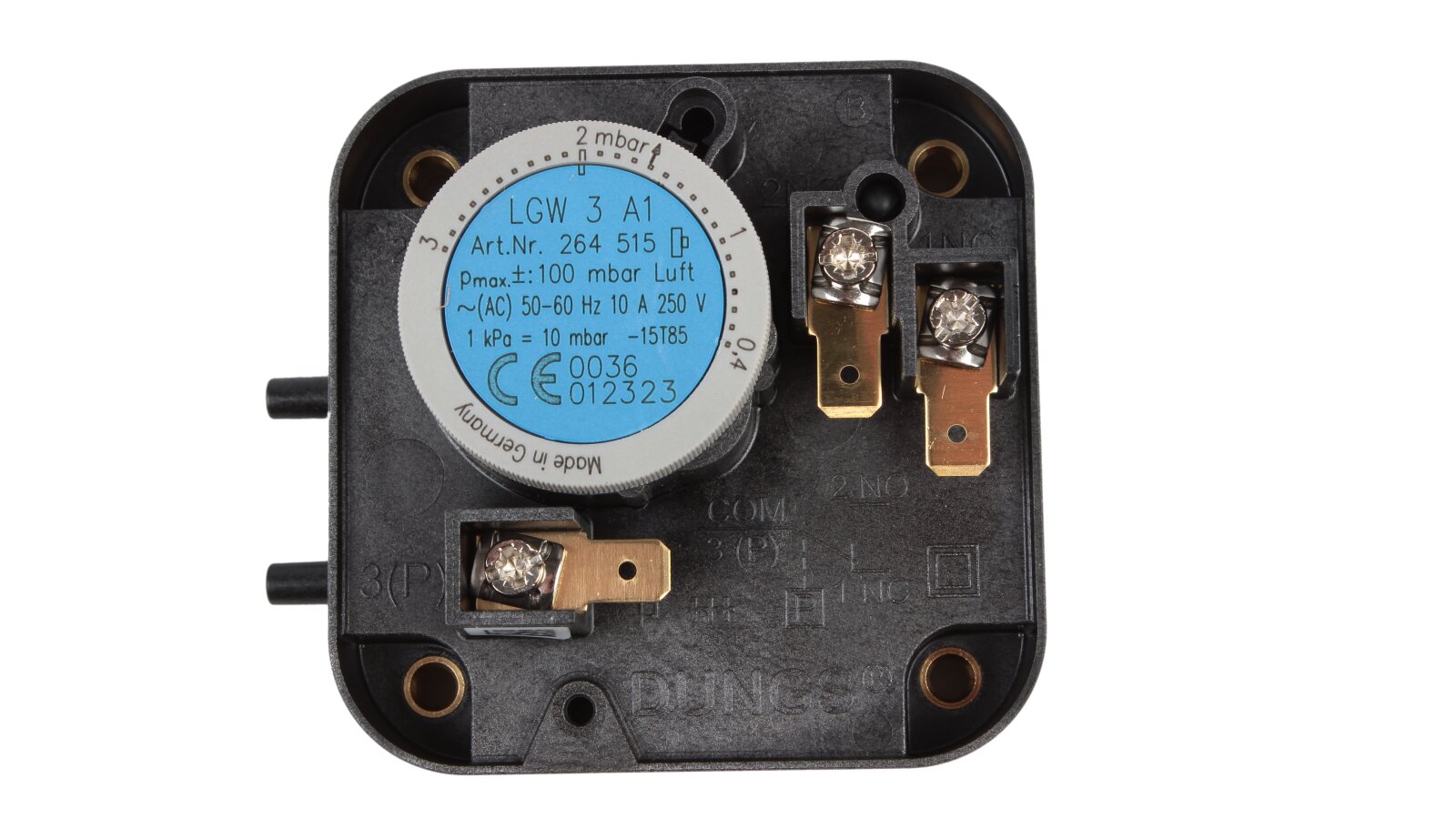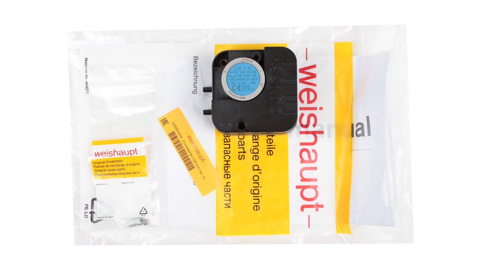 The Weishaupt LGW 3 A1 pressure switch, art.: 691343, has a special switching system that operates without interruption and with high accuracy. Complies with EN 1854. The sensor is compact, easy to install, connect and configure. It is designed to equip automatic differential, excess pressure and vacuum pressure monitoring systems for air or gas. The device is preset to 0.8 mbar at the factory.